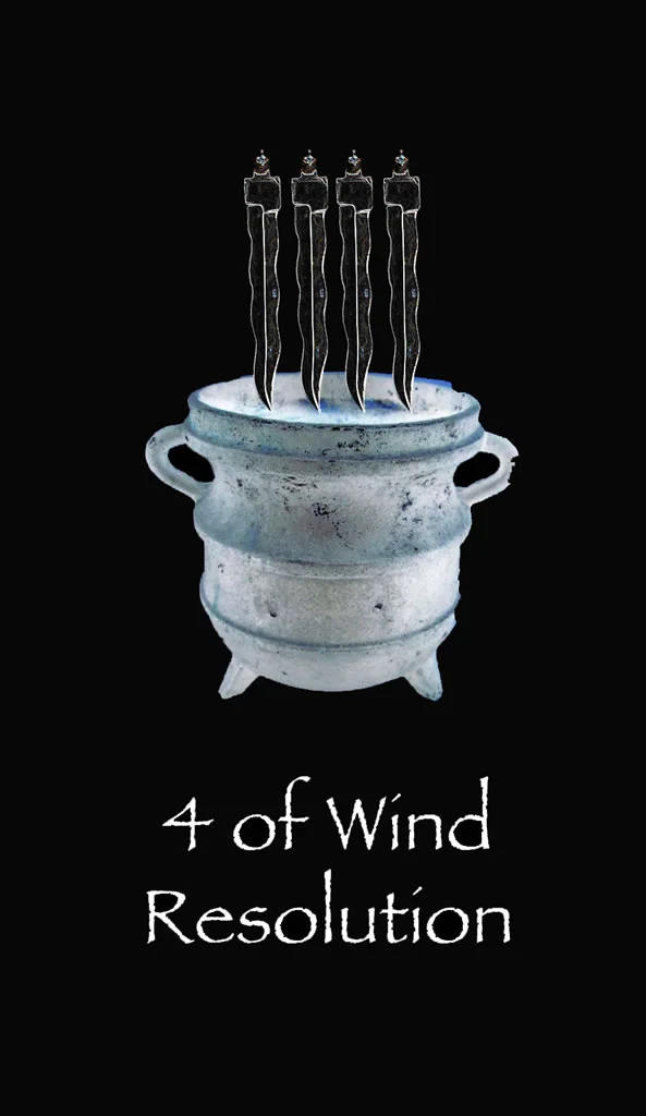 Tiny, iron cauldron. Four wavy bladed daggers.